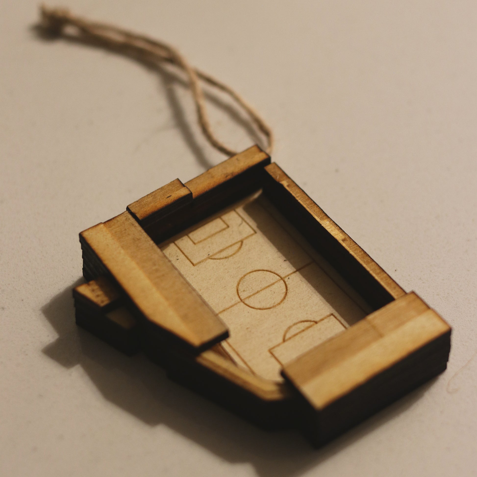 Celebrate your love for Luton Town this festive season with a hand-finished 'Kenny' inspired Christmas tree ornament. Made from intricately laser-cut birch, complete with delicate details that bring the pitch and stands to life.
