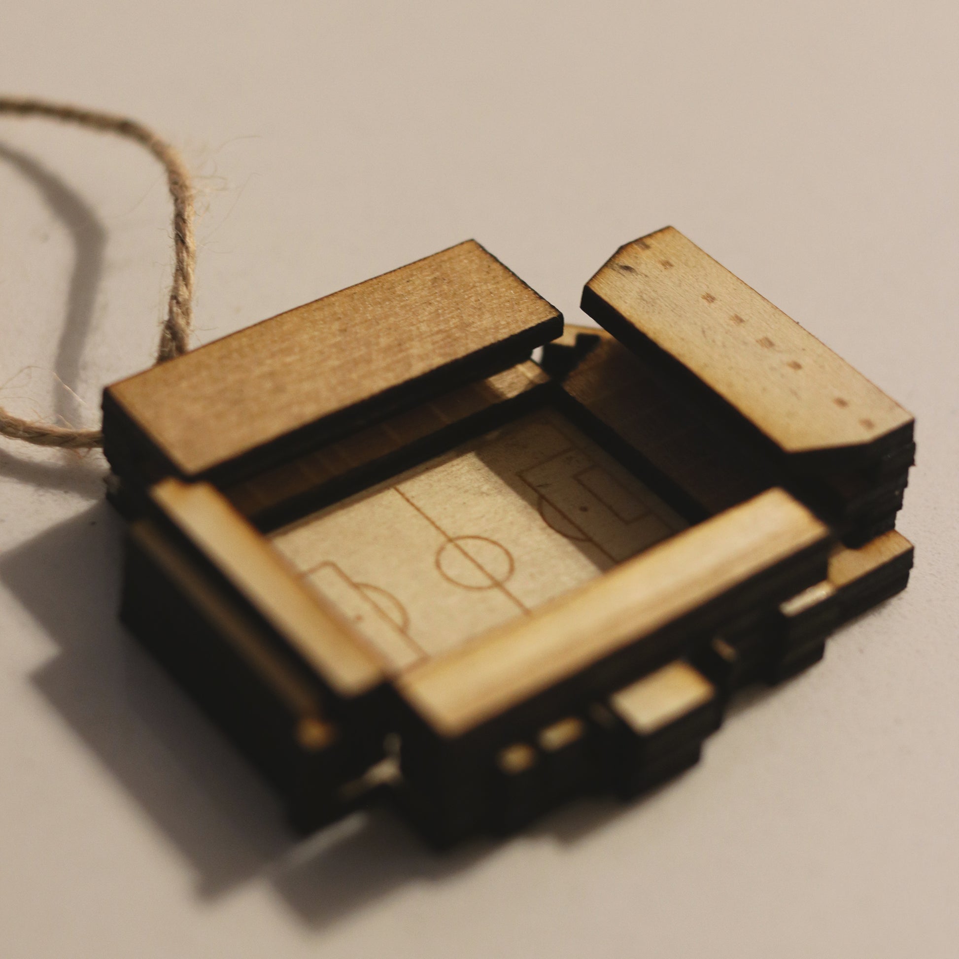 Celebrate your love for Palace this festive season with a hand-finished Selhurst Park inspired Christmas tree ornament. Made from intricately laser-cut birch, complete with delicate details that bring the pitch and stands to life.