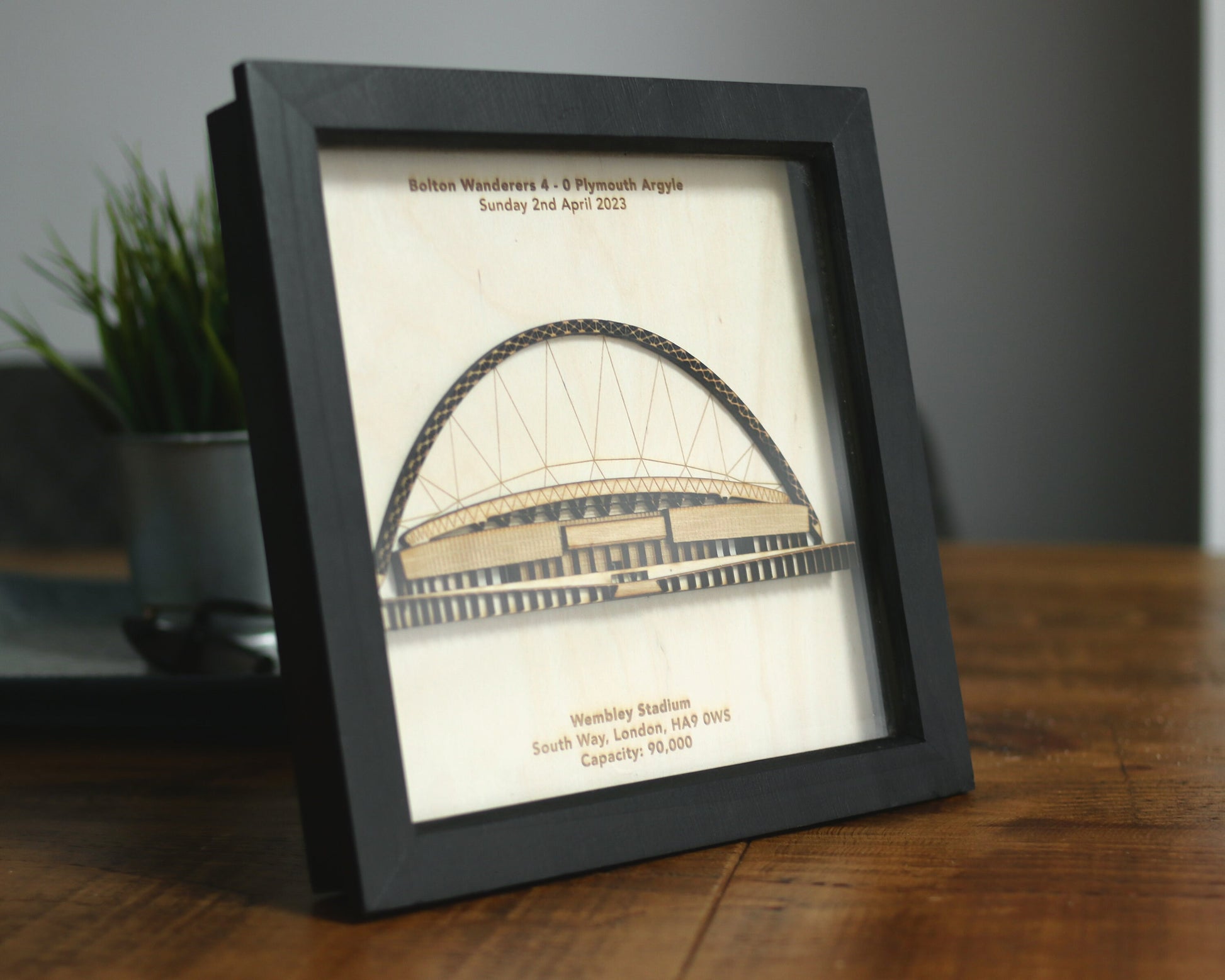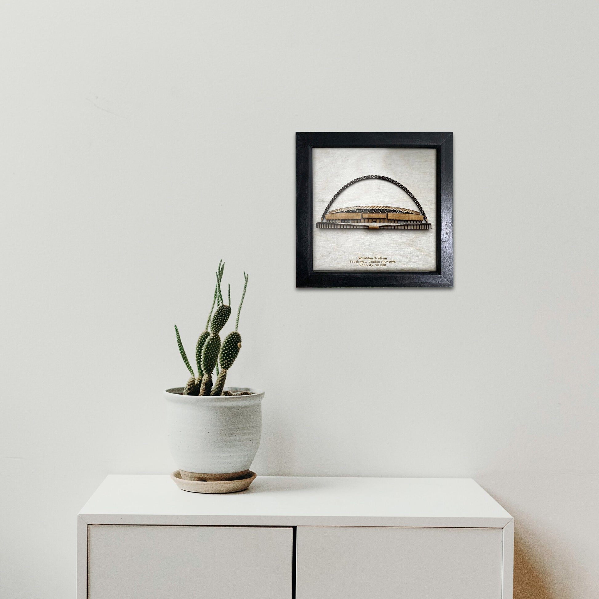 Each of our stadiums is made from laser cut layers of 3mm birch plywood which are hand finished and framed in a deep set black or white box frame.